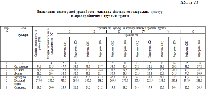 | Оціночна врожайність – це середній урожай культури з одиниці площі посіву на певній агрогрупі з урахуванням ціни бала. Для засвоєння процедури визначення оціночної урожайності основних сільськогосподарських культур за агровиробничими групами ґрунтів на конкретному прикладі складемо табл. 3.1, яка є аналогом табл. 16. В графі 2 табл. 3.1 записуємо основні види сільськогосподарських культур землекористування (об’єкта дослідження). В графі 3 записуються дані балів бонітету по регіону (Б) по кожній сільськогосподарській культурі, а у графі 4 – середньої урожайності за п’ять останніх років 9 (У). Ці показники видаються викладачем на рік проведення оцінки. Ціна бала (Цб) в графі 5 розраховується за такою формулою: ![]() де Ц6 – ціна бала; У – середня врожайність по господарству певної сільськогосподарської культури, ц/га; Б – бал бонітету по регіону певної сільськогосподарської культури. Отже, згідно з наведеними у табл. 3.1 даними розрахуємо оціночну урожайність озимої пшениці: ![]() Графа 6 табл. 3.1 заповнюється таким чином: спочатку записується шифр агрогрупи, а потім – середньозважений бал бонітету з урахуванням поправного коефіцієнта змитості ґрунтів, який береться з табл. 3.2 „Визначення балів бонітету за агровиробничими групами ґрунтів” (табл. 15). Кількість граф подібних 6 , у таблиці буде стільки, скільки існує агрогруп на ріллі. Оціночну урожайність визначаємо за формулою: ![]() де Уо – оціночна урожайність певної сільськогосподарської культури на певній агрогрупі, ц/га; Багр – середньозважений бал бонітету з урахуванням поправного коефіцієнту, бали; Цб – ціна бала певної сільськогосподарської культури. За допомогою цієї формули визначимо оціночну врожайність озимої пшениці на агрогрупі І: ![]() Для обґрунтування значущості і подальшої економічної оцінки різноякісних ґрунтів використовуються критерії їх оцінки через кадастрову врожайність сільськогосподарських культур, що визначається як результативна багаторічна врожайність сільськогосподарських культур на кадастровому гектарі. Для визначення кадастрової урожайності сільськогосподарських культур за агровиробничими групами ґрунтів складемо табл. 5.2, яка є аналогом табл. 17. У графу 2 табл. 3.2 записуються сільськогосподарські культури, які вирощують у господарстві. Показники середньої урожайності по району та середньої зональної врожайності видаються викладачем і заносяться до граф 3 і 4 відповідно. Графи оціночної урожайності заносяться за результатами табл. 5.1 (табл. 16). Кадастрова врожайність сільськогосподарських культур господарства за агровиробничими групами ґрунтів розраховується за формулою : ![]() де X – кадастрова урожайність, ц/га; X1 – середня урожайність у господарстві, ц/га; Х2 – середня зональна урожайність, ц/га; Х3 – оціночна урожайність, ц/га. Відповідно до цієї форми визначимо кадастрову урожайність озимої пшениці на агрогрупі І: ![]() ![]() ![]() Джерело матеріалу: Державний земельний кадастр. Практичний посібник. 2013 | |