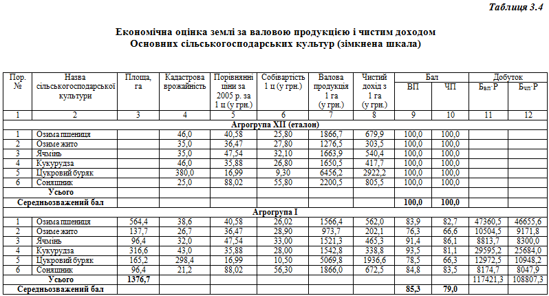 | На основі попередніх розрахунків складемо табл. 3.4 „Замкнена шкала економічної оцінки землі по валовій продукції і чистому доходу основних сільськогосподарських культур”, яка є аналогом табл. 19. На першому етапі визначається еталонний ґрунт, на якому одержують найвищі економічні показники. За умовами лабораторної роботи показники еталонного ґрунту видаються викладачем для кожного окремого об’єкта дослідження. У графі 2 табл. 5.4 наводимо перелік сільськогосподарських культур, які вирощуються у господарстві. Тепер вносимо в таблицю дані стосовно еталонної агрогрупи. Графа 3 не заповнюється, тому що еталонна агрогрупа відсутня на території господарства. Потім у графах 4, 5 і 6 записуються еталонні показники кадастрової врожайності сільськогосподарських культур (ц/га), закупівельної ціни (гривень за 1 ц) та собівартості продукції (гривень за 1 ц) (значення показників видаються викладачем), з урахуванням яких визначаємо розмір валової продукції та чистого доходу для еталону. Згідно з формулами 5.4 і 5.5 проводяться розрахунки. Наприклад, визначимо значення валової продукції та чистого доходу озимої пшениці на еталонній агрогрупі XII: • ВП = 46,0• 40,58 = 1866,7 грн. /га; • ЧД = 1866,7 - (46,0 • 25,8) = 679,9 грн./га. Розрахунок балів еталонного ґрунту не проводять, оскільки показники еталонної групи приймаються за 100 балів. Оціночні бали за сільськогосподарськими культурами на агрогрупах визначаємо стосовно еталонних показників. За результатами оціночних балів по культурах визначаємо середньозважені бали економічної оцінки земель агрогруп господарства. На прикладі агрогрупи І з’ясуємо порядок визначення балів. У графу 3 табл. 5.4 виписуємо з табл. 4.1 площі, зайняті основними сільськогосподарськими культурами під окремими агрогрупами (табл. 18). Потім, послідовно до граф 4, 5 і 6 вносяться критерії економічної оцінки агрогрупи І. Кадастрова врожайність сільськогосподарських культур на агрогрупі І була визначена у табл. 5.2 (табл. 17). Значення порівнянних цін та собівартості продукції сільськогосподарських культур на агрогрупі видається викладачем або виписується з статистичних щорічників. Необхідно зазначити, що порівнянні ціни є однаковими як для еталонної агрогрупи, так і для інших агрогруп господарства. Слід звернути увагу на те, що ці показники були нами вже виписані та застосовані при побудові розімкненої шкали економічної оцінки земель. Валова продукція окремих сільськогосподарських культур записується у графу 7 табл. 5.4 і визначається за формулою 5.4. Для озимої пшениці на агрогрупі І валова продукція становитиме: ВП = 38,6 • 40,58 = 1566,4 грн./га. Для агрогрупи І чистий дохід від вирощування озимої пшениці згідно з формулою 5.5 становить: ЧД = 1566,4 - (38,6 • 26,02) = 562,0 грн. / га. ![]() Результати вносяться до графи 8 табл. 5.4 у рядок „Озима пшениця”. Згідно з формулами 5.6 і 5.7 економічна оцінка земель за валовою продукцією та чистим доходом від вирощування озимої пшениці на агрогрупі І становить: ![]() Для визначення середньозваженого бала економічної оцінки земель окремої агрогрупи в графах 11 і 12 табл. 5.4 записуються добуток площ і бала оцінки за валовою продукцією і чистим доходом відповідно. Середньозважені значення за валовим продуктом та чистим доходом на окремій агрогрупі визначаються за формулами 5.8 та 5.9 і становлять для озимої пшениці агрогрупи І відповідно
